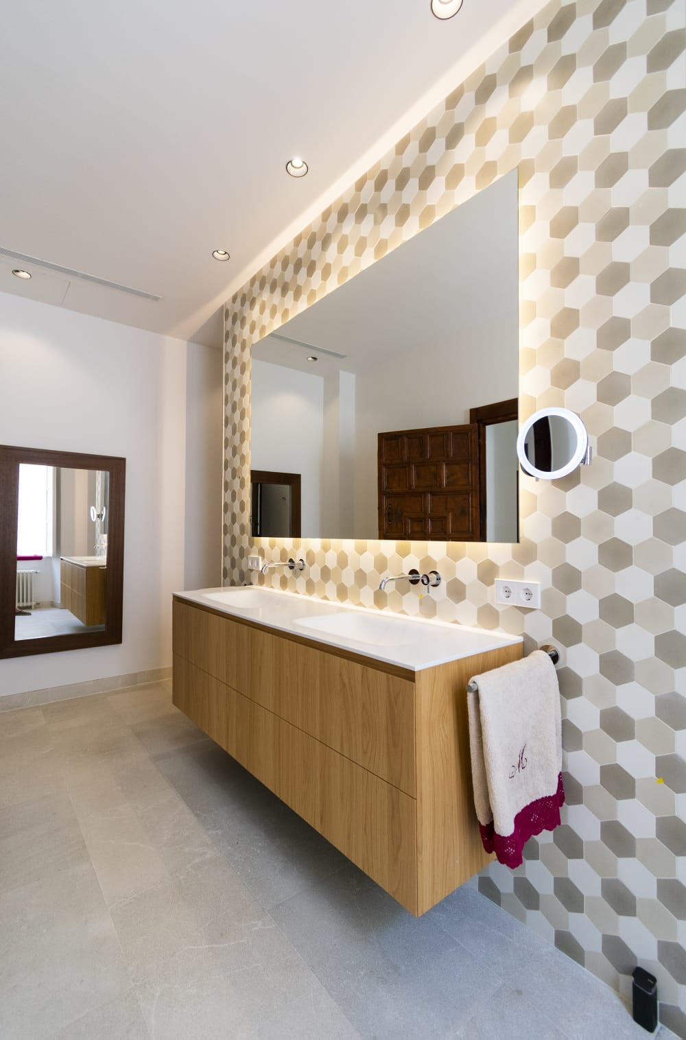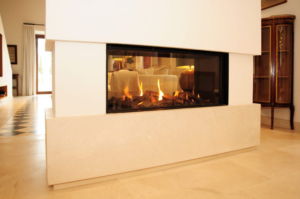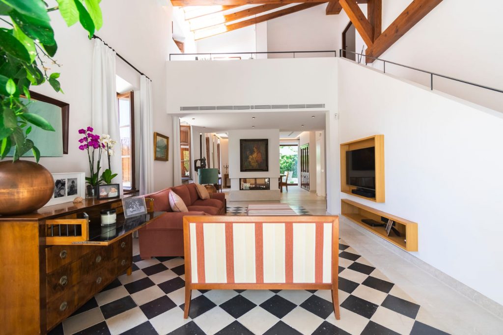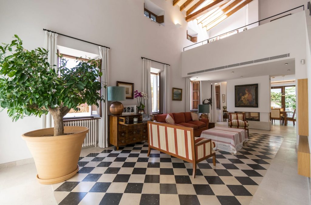 Første sal: stue med pejs, spisestue med pejs, køkken, 1 soveværelse med badeværelse ensuite og påklædningsværelse, gæstetoilet, 2 terrasser, opbevaringsrum, bryggers