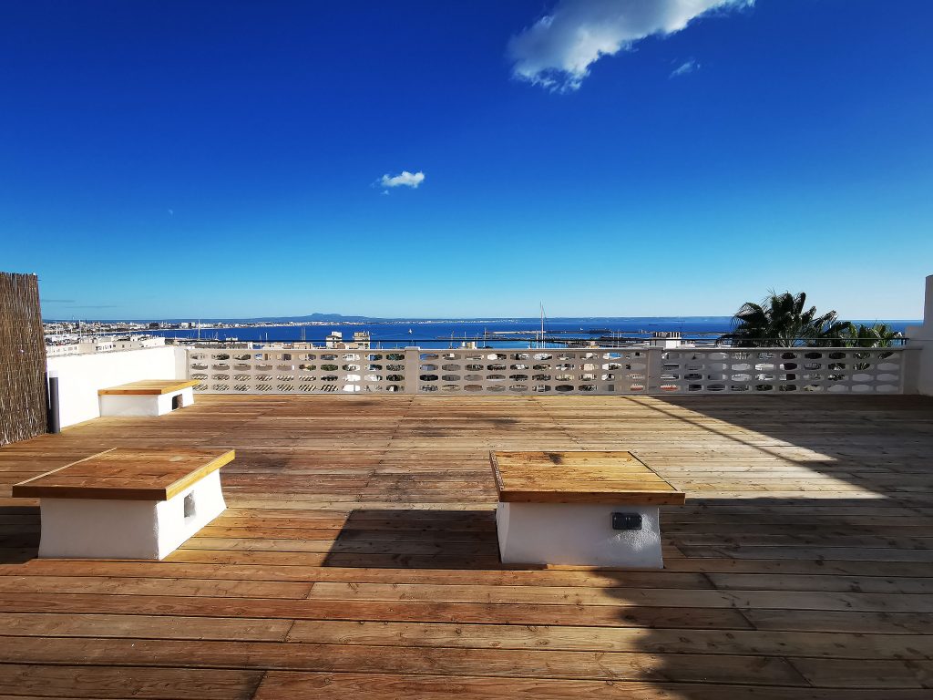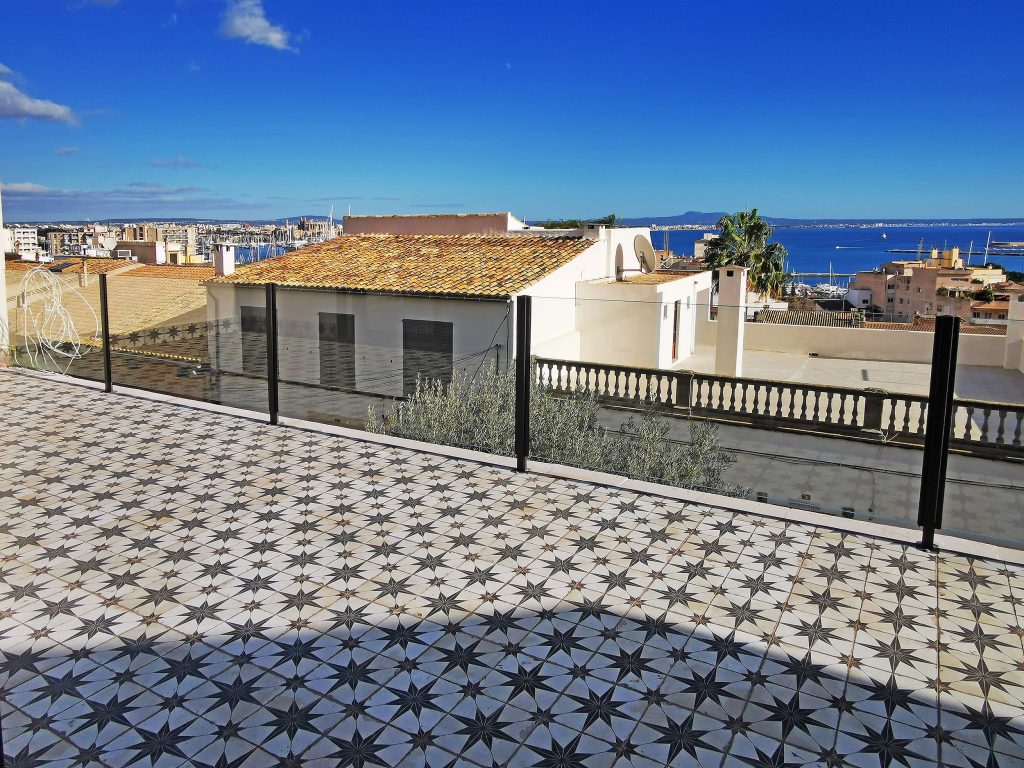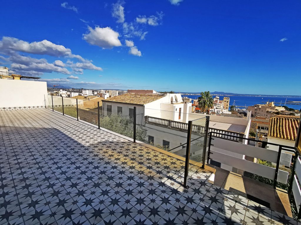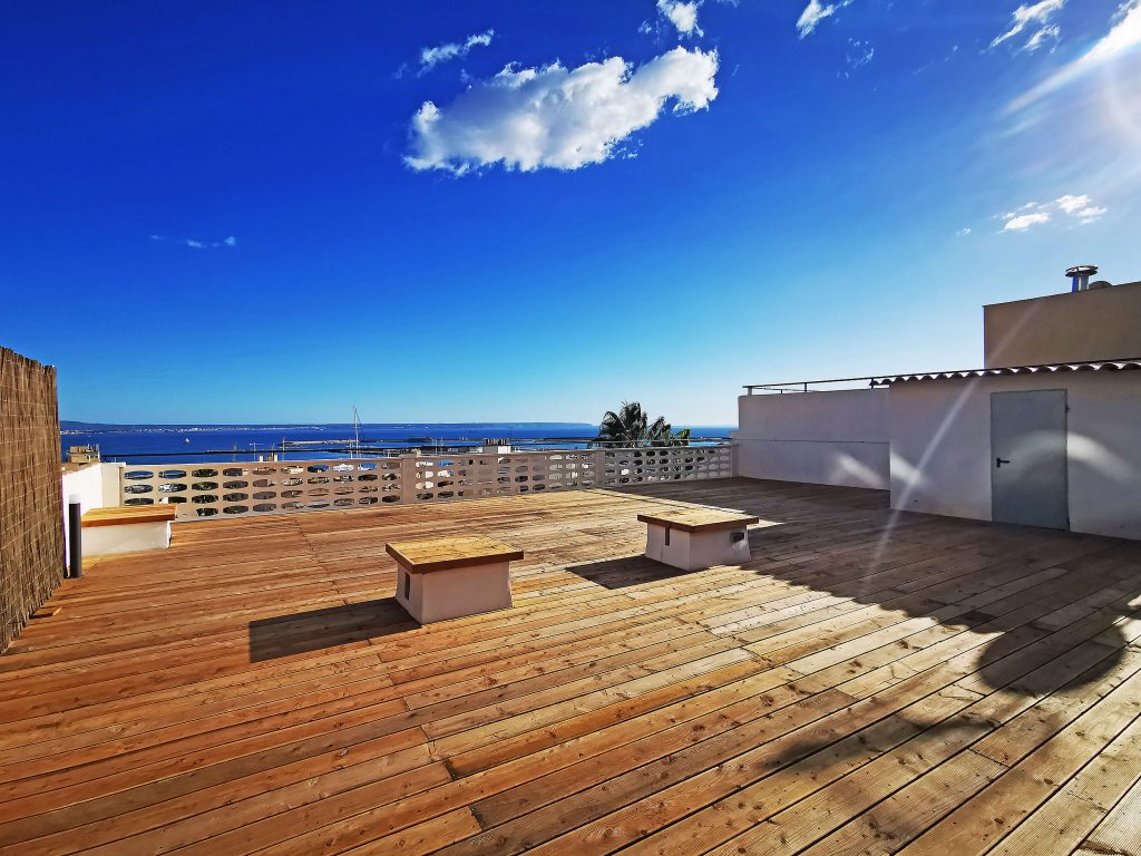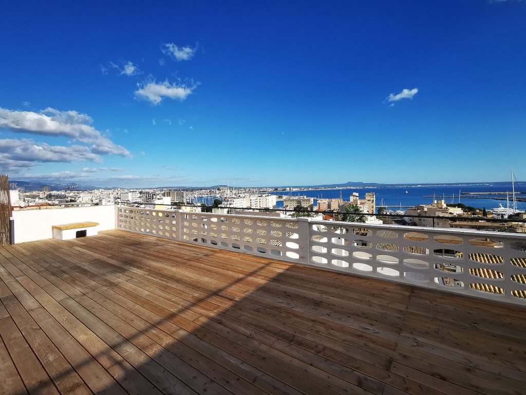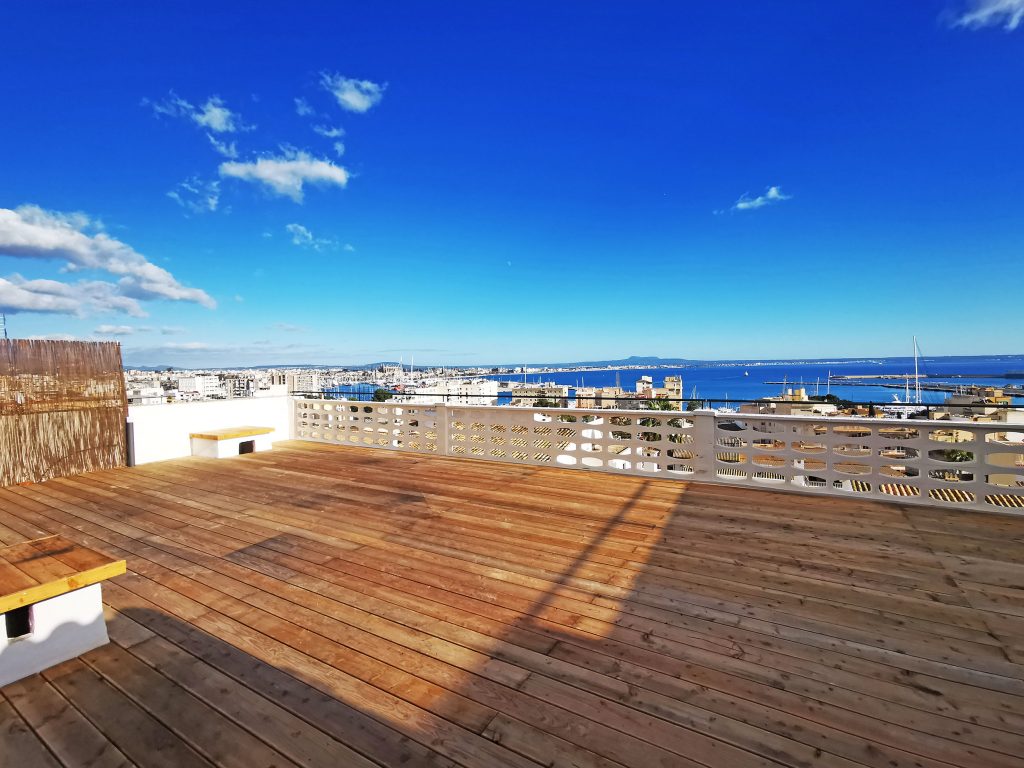 Et andet højdepunkt er den 140kvm store tagterrasse, som du kan nå via en trappe fra køkkenet. Som en del af renoveringsarbejdet var dette fuldt udstyret med trægulvbrædder og er udstyret med en privatlivsskærm. Fra tagterrassen har du en eksklusiv udsigt over Tramontana, katedralen og havet. Uanset om det er en grill med venner eller en pause fra stressende hverdag, er afslapning garanteret her. På tagterrassen er der et opbevaringsrum på ca. 6 kvadratmeter, som er udstyret med vand- og elforbindelse.