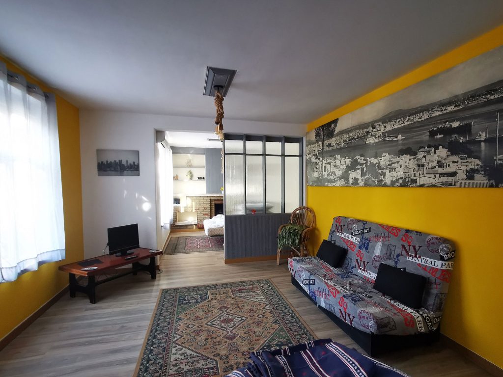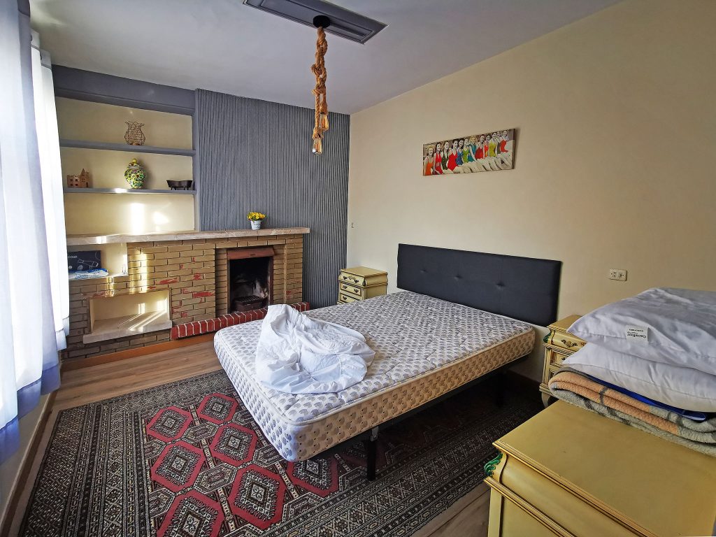 Gæstelejlighed: stue med lille køkken, soveværelse med pejs, terrasse