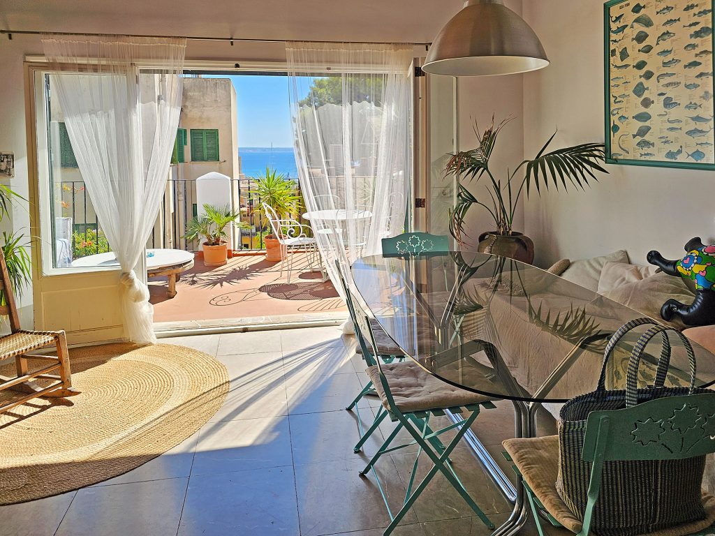 På første sal er opholdsstuen med stue, 2 soveværelser, det ene med påklædningsværelse, 2 badeværelser og 2 udendørsområder, en fransk altan ud mod havet og en terrasse ud mod