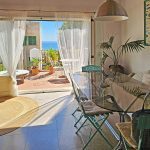 På første sal er opholdsstuen med stue, 2 soveværelser, det ene med påklædningsværelse, 2 badeværelser og 2 udendørsområder, en fransk altan ud mod havet og en terrasse ud mod
