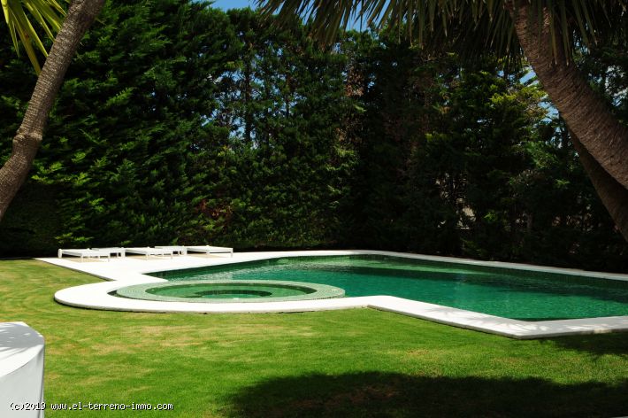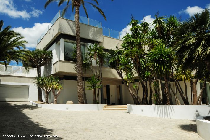 Layout: This 3-year-old luxury villa has been completely renovated using first-class qualities and has 5 bedrooms and 5 bathrooms in the main house and a completely separate guest house with living-kitchen sleeping area, bathroom and private entrance. A large, fully equipped light kitchen with adjoining dining room is complemented by a separate work kitchen and the outdoor barbecue kitchen. The large living room leads out into the garden and pool area. A spacious saltwater swimming pool with heated jacuzzi and the garden, which has grown over decades, invite you to relax. In the dreamlike outdoor areas there are different seating groups on different levels, which invite you to linger. The highlight is the huge roof terrace with jacuzzi. There you reside over the city and can enjoy the sea view. Around the basement there is next to the technology of the house, a beautiful old wine cellar with its own exit to the outdoors and a fitness room. Various storage and utility rooms as well as dressing rooms and a large garage complete the top equipment of this property.