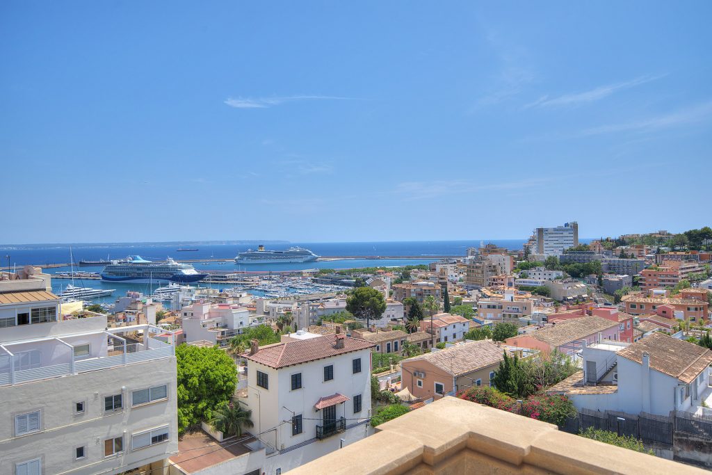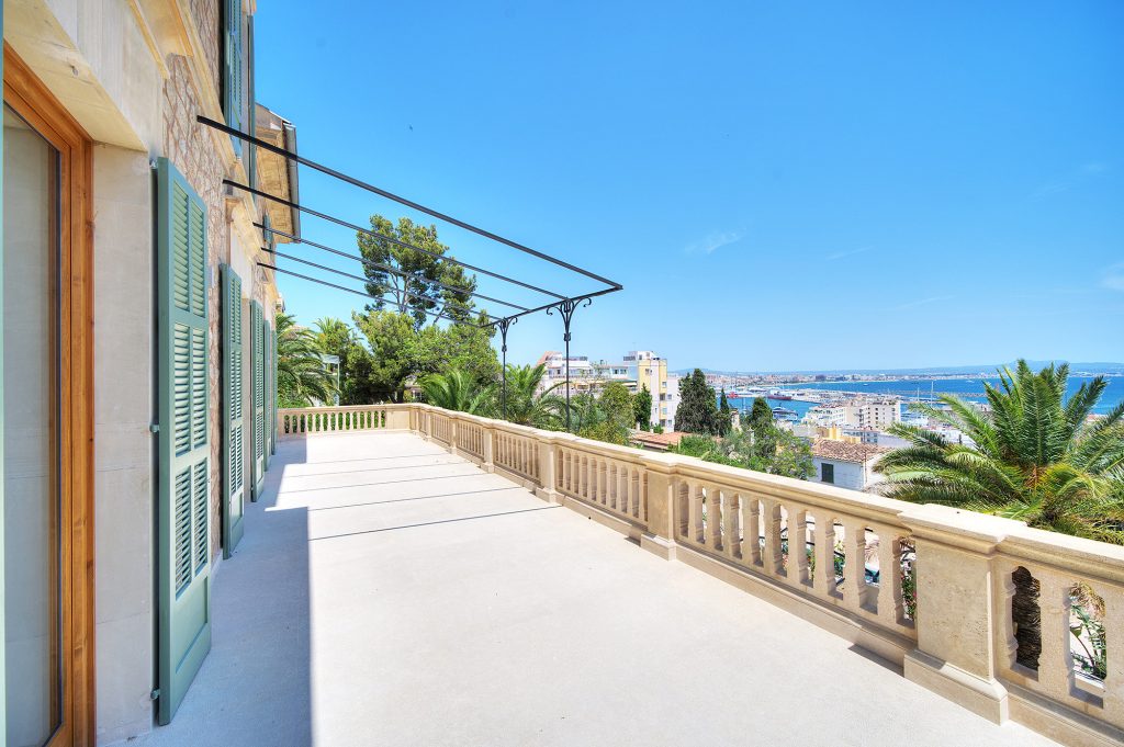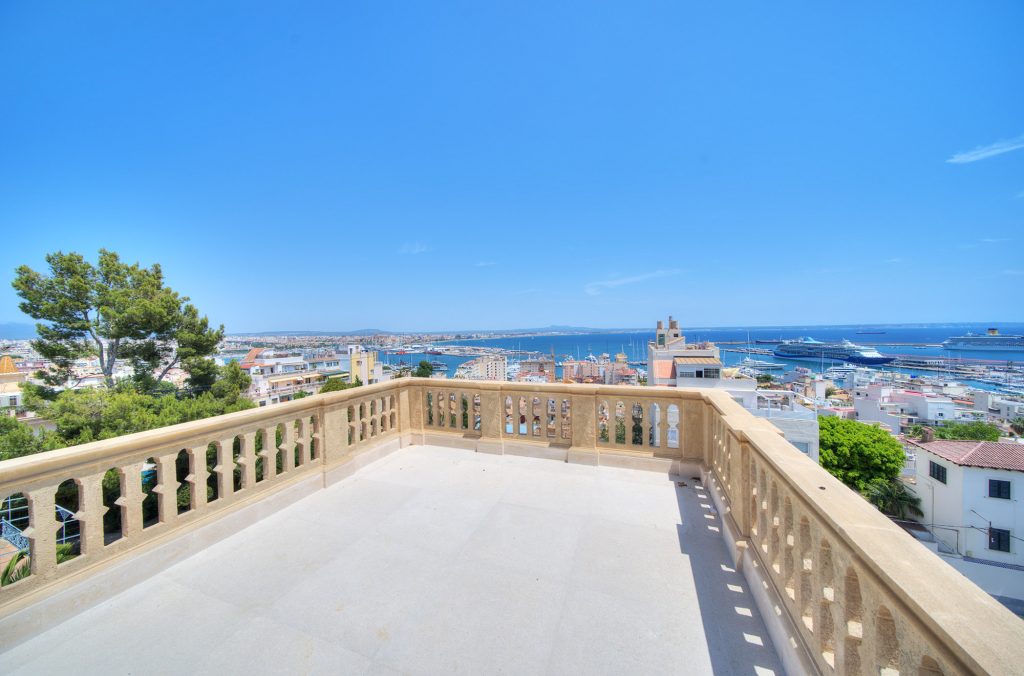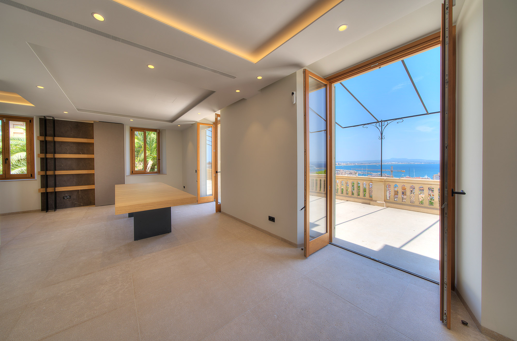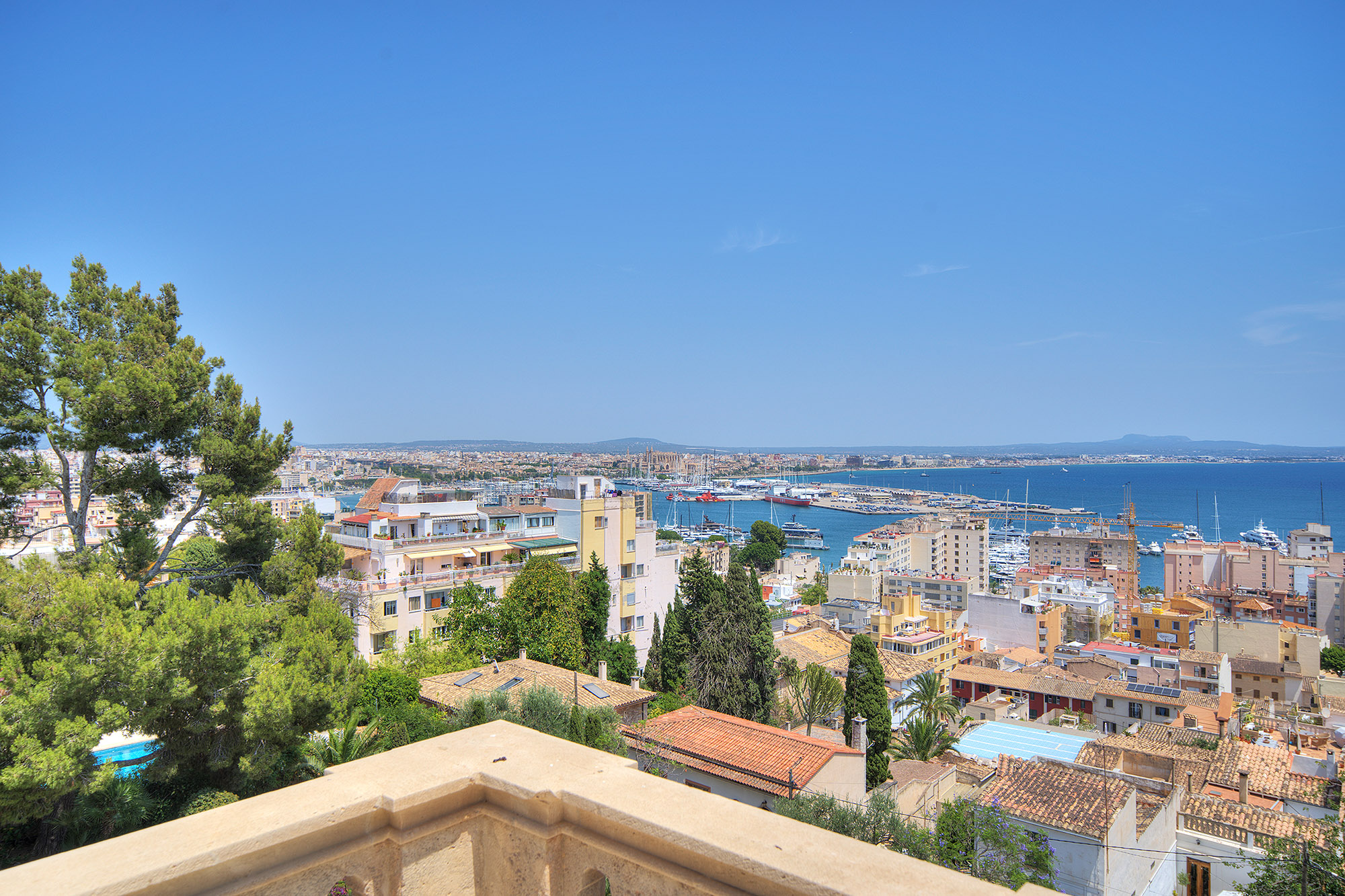 We present you this spectacular mansion in the La Bohéme district of El-Terreno, located below Bellver Castle with its magnificent castle park. It is a historic manor house on a very spacious fillet plot (accessible from 2 streets) with magnificent panoramic views over the bay of Palma and the cathedral. Extraordinary: already from the ground floor/garden there is a stunning sea view. Completion: early 2025. The house offers 613m2 of living space , distributed over 3 equal floors with sea views on each level. Layout: