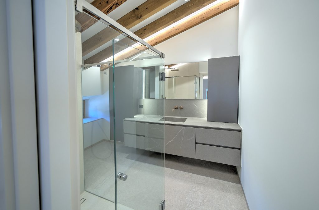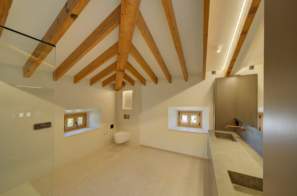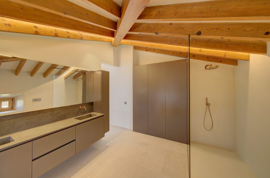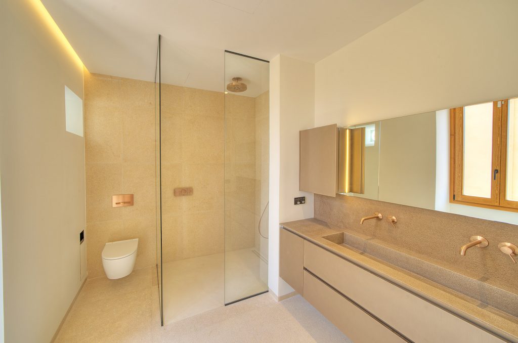 Ground floor: 2 bedrooms with en suite bathroom and dressing room – both rooms have direct access to the terrace Middle floor: open & bright living-dining room with fireplace, fully equipped kitchen Upper floor: 3 bedrooms each with en suite bathroom Highlights: underfloor heating, large garage, air conditioning, fireplace, elevator