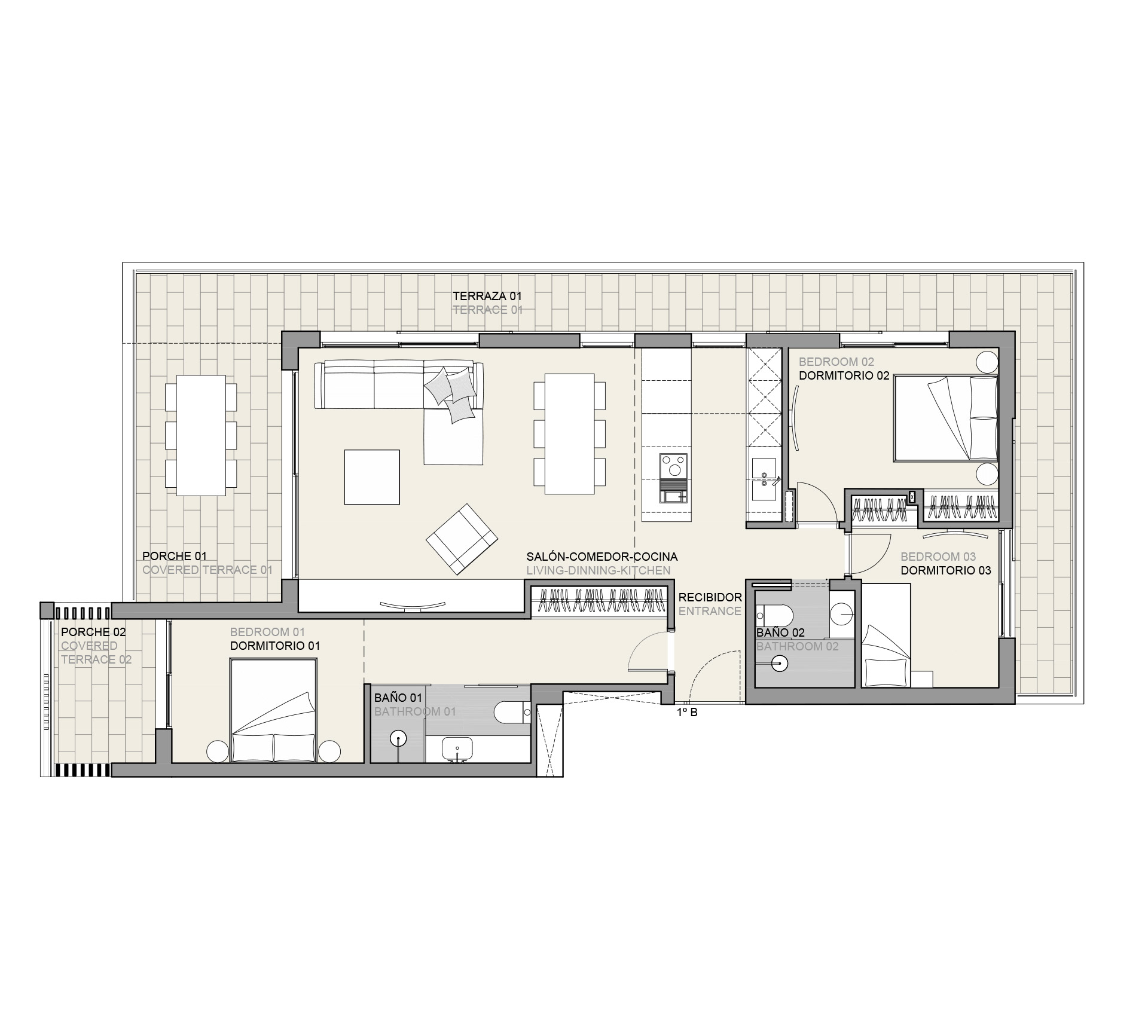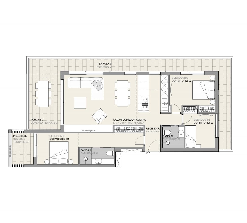 The apartment is located on the first floor and has a living area of 100m2 plus 46m2 terraces. The open plan living and dining area with modern designer kitchen leads out to the private terraces. It has 3 bedrooms, 2 bathrooms and 1 underground parking space.