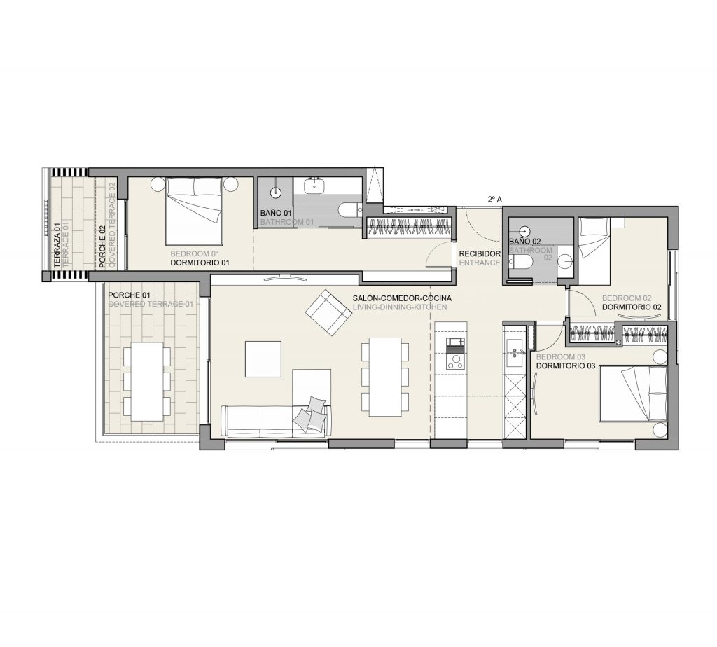 The apartment has a living area of 100m2 plus 20m2 terrace. The open plan living and dining area with modern designer kitchen leads out to the private covered terrace. It has 3 bedrooms, 2 bathrooms and 1 underground parking space.
