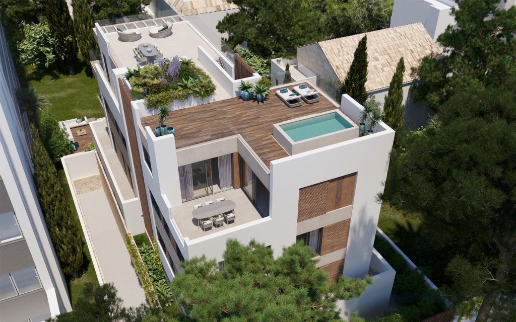 This new construction project of a luxury apartment complex is located in El Terreno near the Bellver Park in a quiet yet urban location, close to the center of Palma. Many shops, restaurants and the Paseo Maritimo are within walking distance.