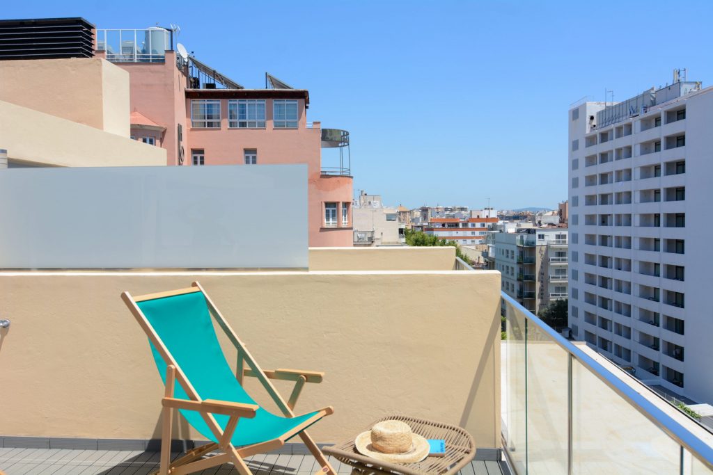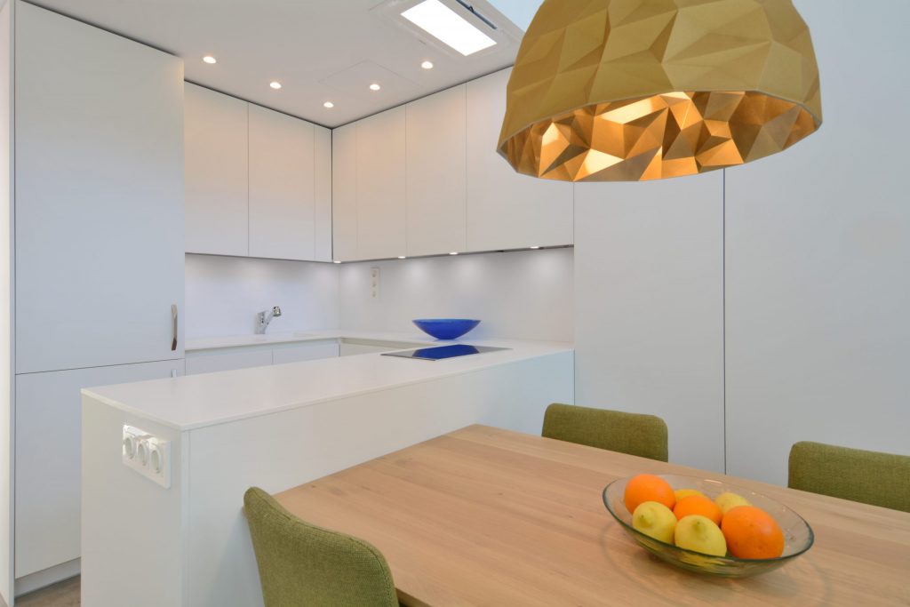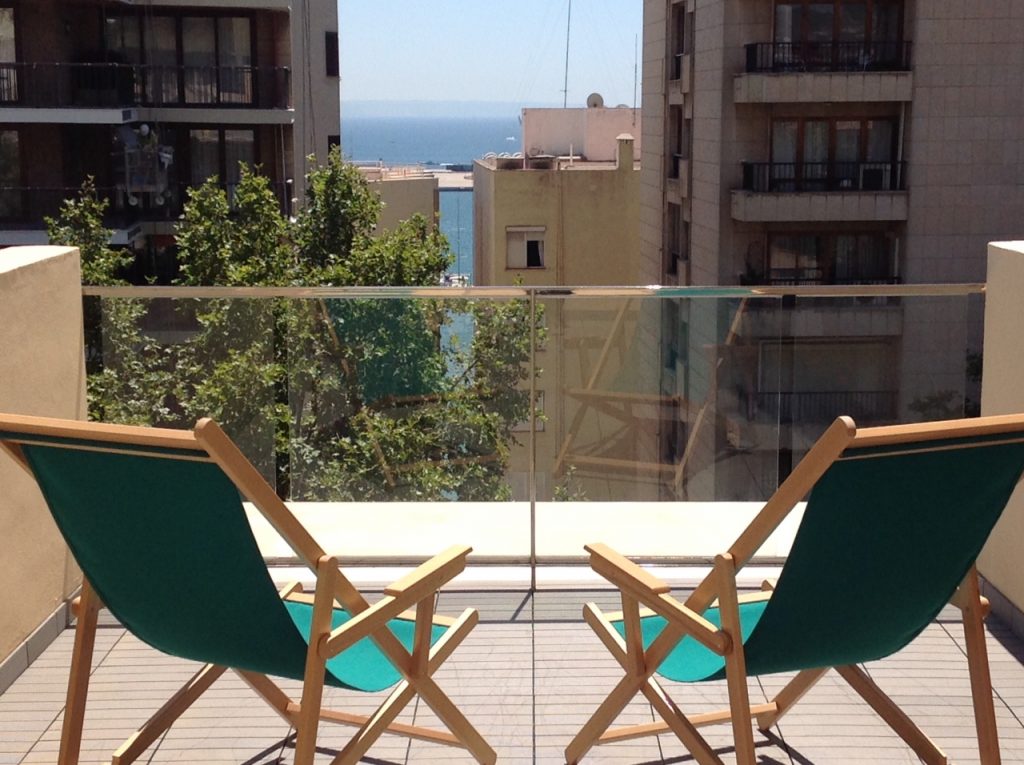 On the entrance level is the living and dining room, the high-quality kitchen, as well as a balcony. One floor below are the 2 bedrooms with 2 bathrooms, one of them with bathtub and one with shower. The roof terrace offers sea views.