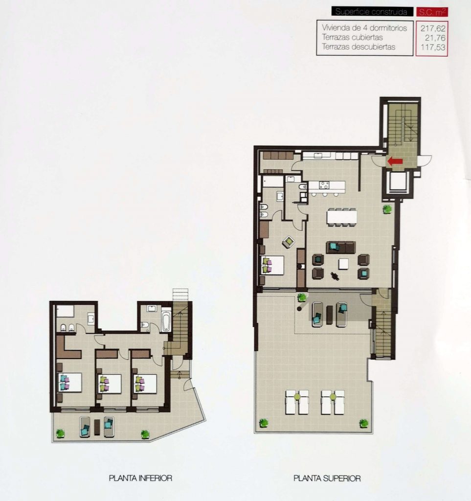 On the entrance level is the spacious living and dining area as well as a modern kitchen, one of the 4 bedrooms with bathroom en-suite, a guest bathroom and the large sun terrace. One floor below there are 3 more bedrooms and two bathrooms one of them en-suite. In front of the bedrooms is another sun terrace with direct access to the communal pool. From the complete apartment you can enjoy the fantastic panoramic view of the sea and the city.