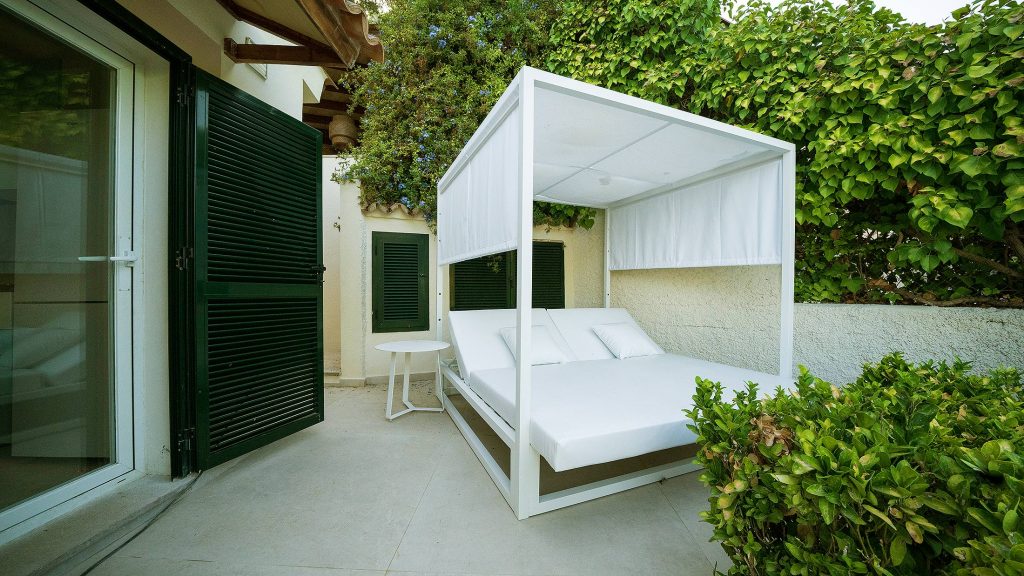 Layout upper floor: one bedroom with private balcony, master bedroom with office and bathroom en suite and private balcony, sea view