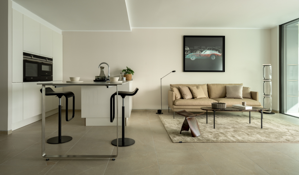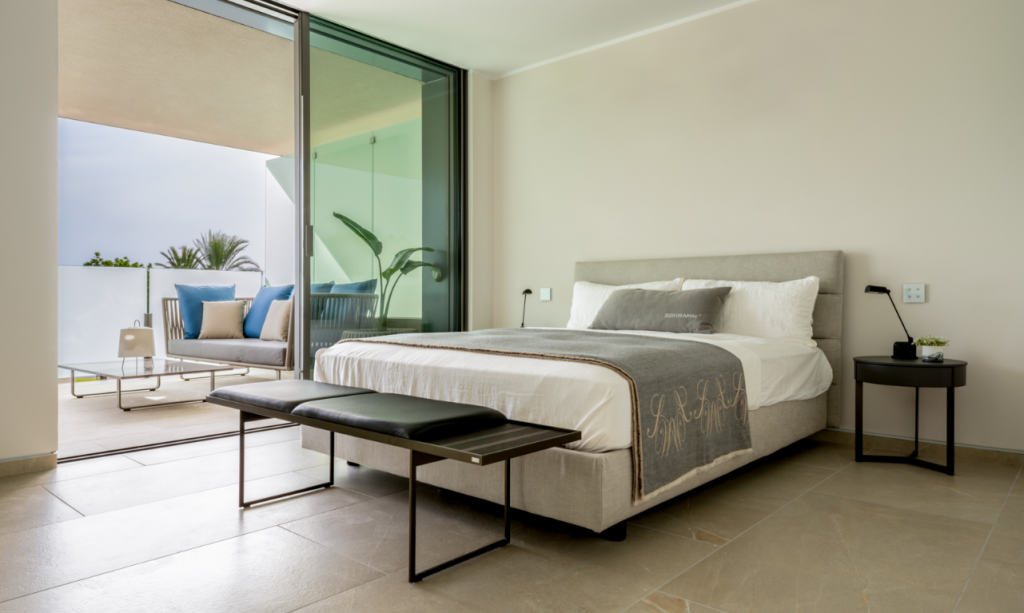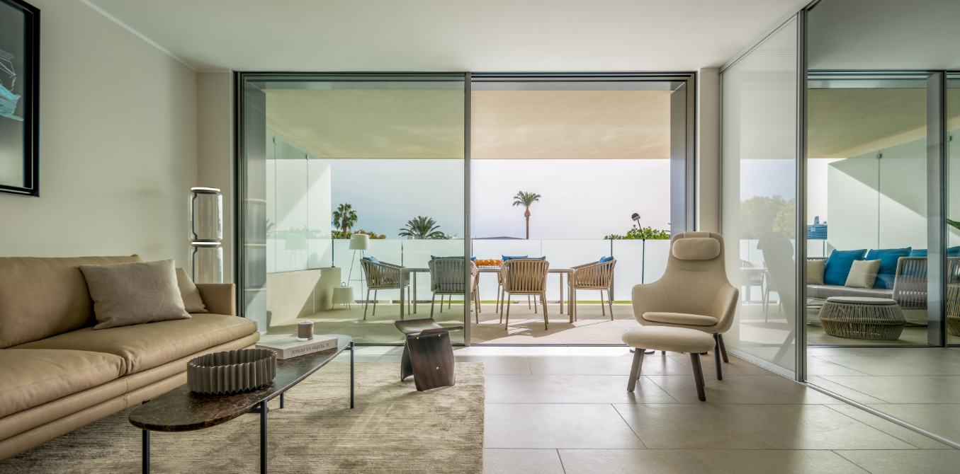The modern apartment impresses with huge windows that perfectly capture the Mediterranean light and the panoramic views of the sea and the harbor.
