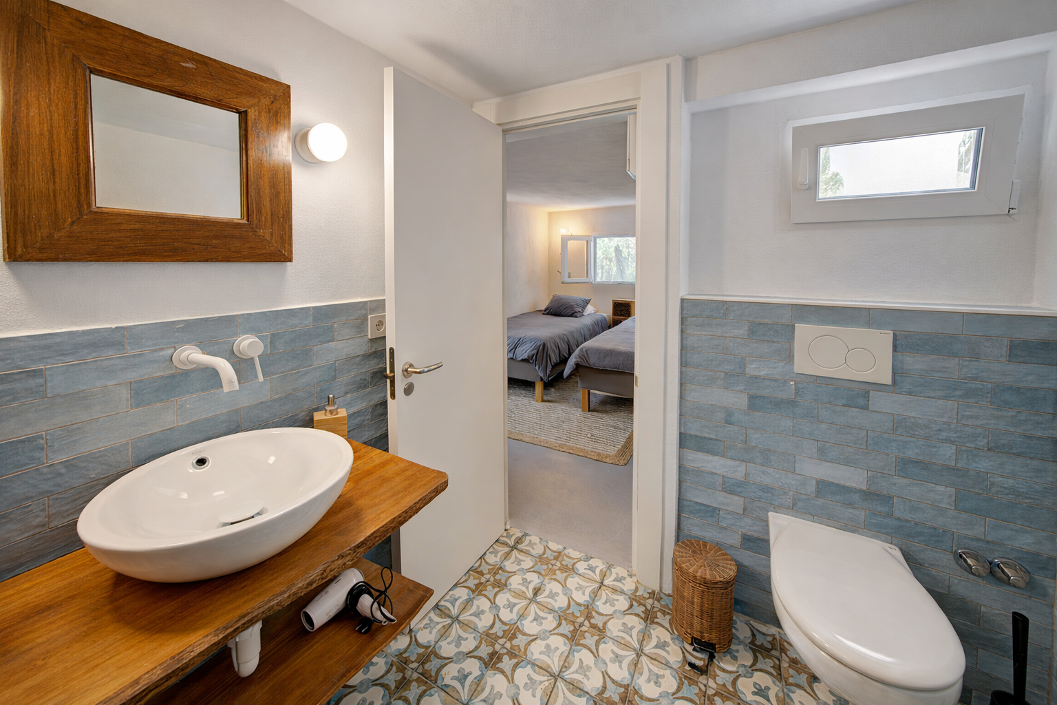 Main house: living-dining room with open kitchen, 3 bedrooms, 2 bathrooms