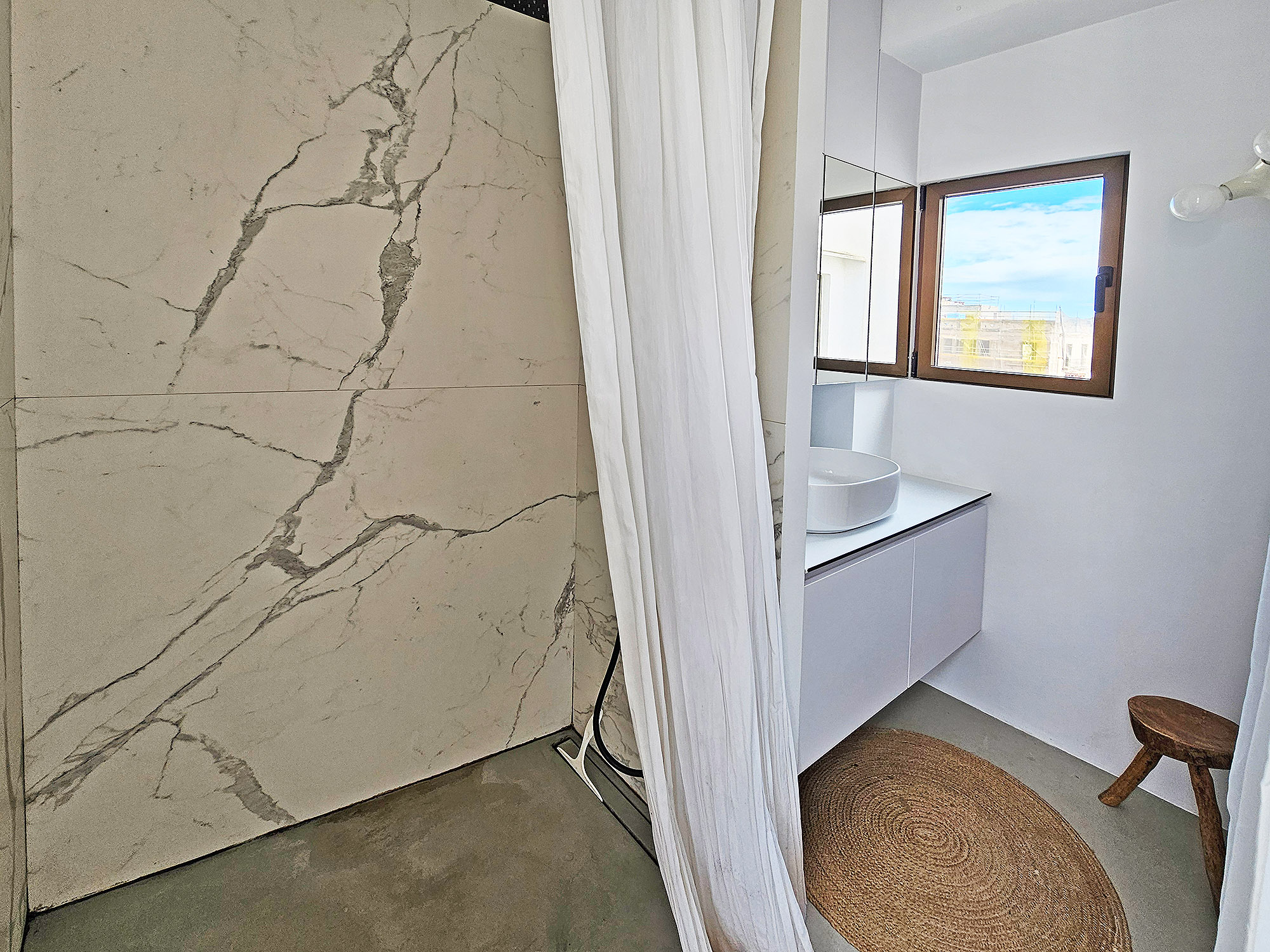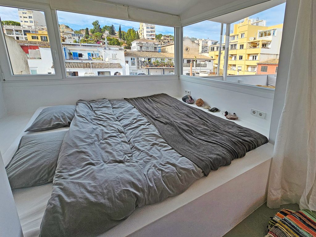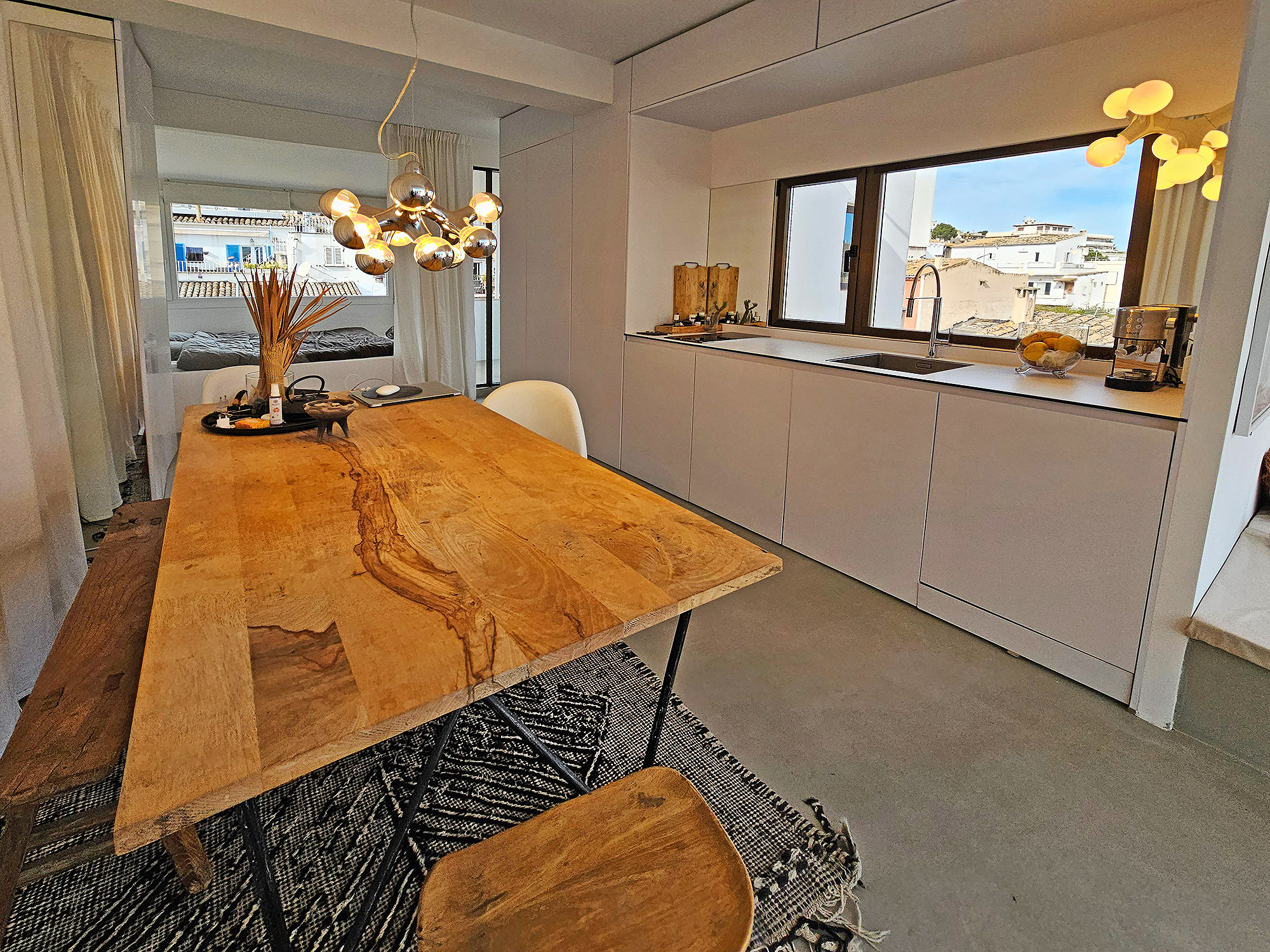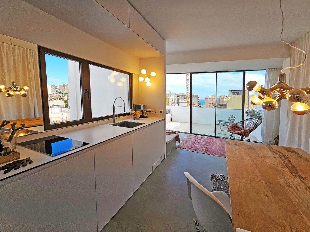 This penthouse is located in Palma’s trendy bohemian neighbourhood of El Terreno on the 3rd floor of a well-kept building. The apartment has been completely renovated and has 2 terraces, one facing the sea and one facing the park with its Bellver Castle to enjoy the evening sun.