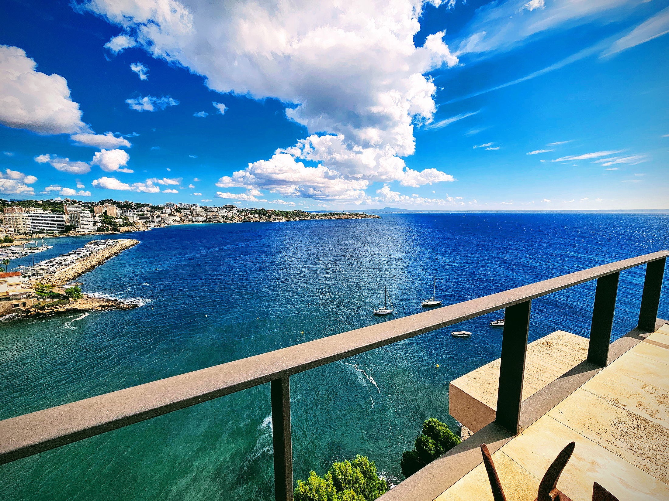 The 360 degree panoramic view of the sea, the harbour, the mountains and the city is simply breathtaking! And that from every room of this unique penthouse. It is located in one of the most popular developments in the southwest in Illetas, with a swimming pool by the sea and 2 direct beach accesses, 24-hour concierge service and garbage collection directly in the hallway. This real estate package consists of 3 individual apartments and a covered parking space. Currently, the three apartments have been merged to create a beautiful large duplex penthouse with 4 terraces. Distribution: 3 bedrooms, 3 bathrooms, living-dining room, kitchen, laundry room, outdoor kitchen on the large terrace, 3 further terraces.