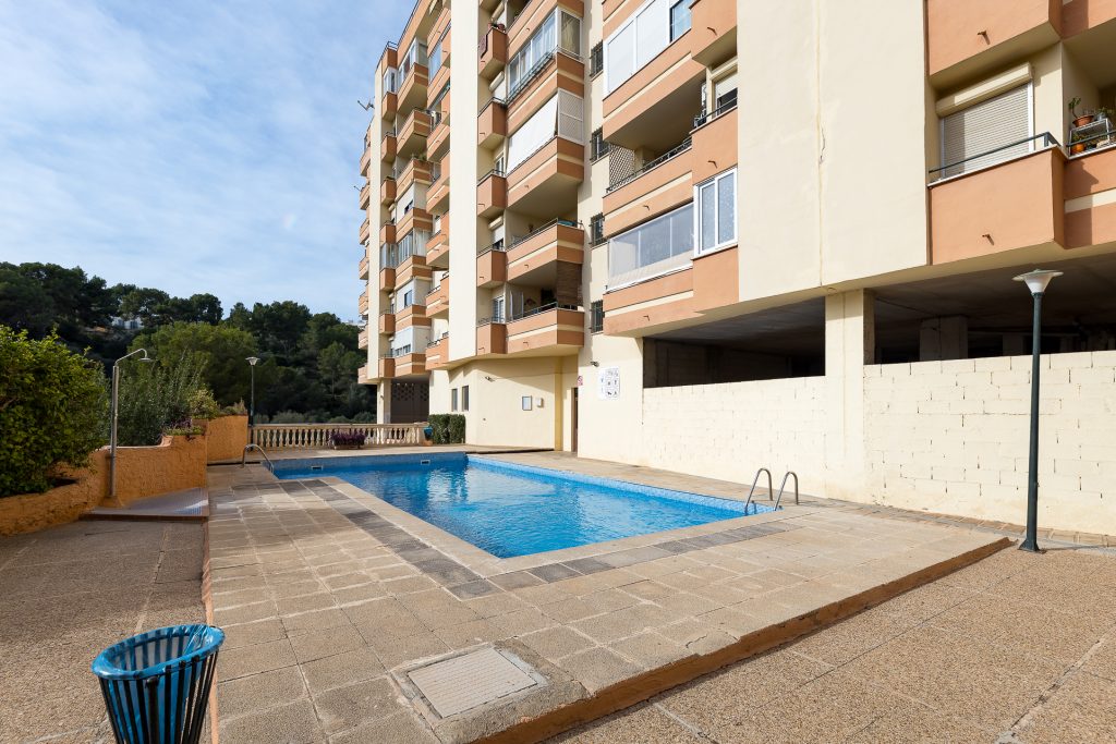 In total there are 2 bedrooms, a living and dining room with an open kitchen, a bathroom and a balcony. A special feature is the large communal pool.