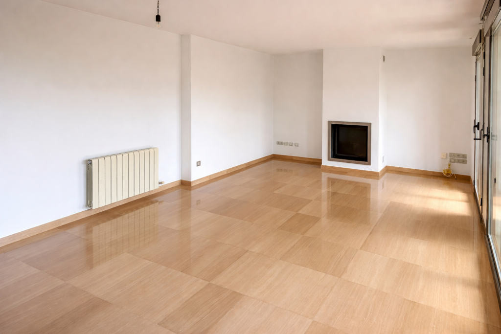 The bright living room with fireplace creates a particularly cozy atmosphere and offers direct access to the living areas. Air conditioning and town gas heating ensure year-round comfort.