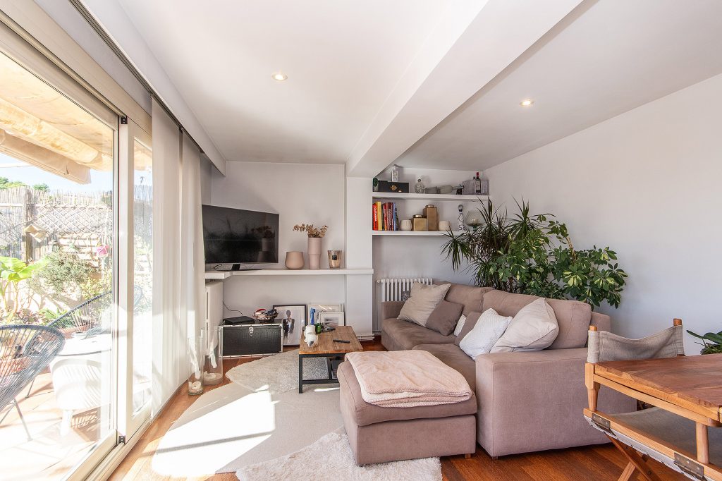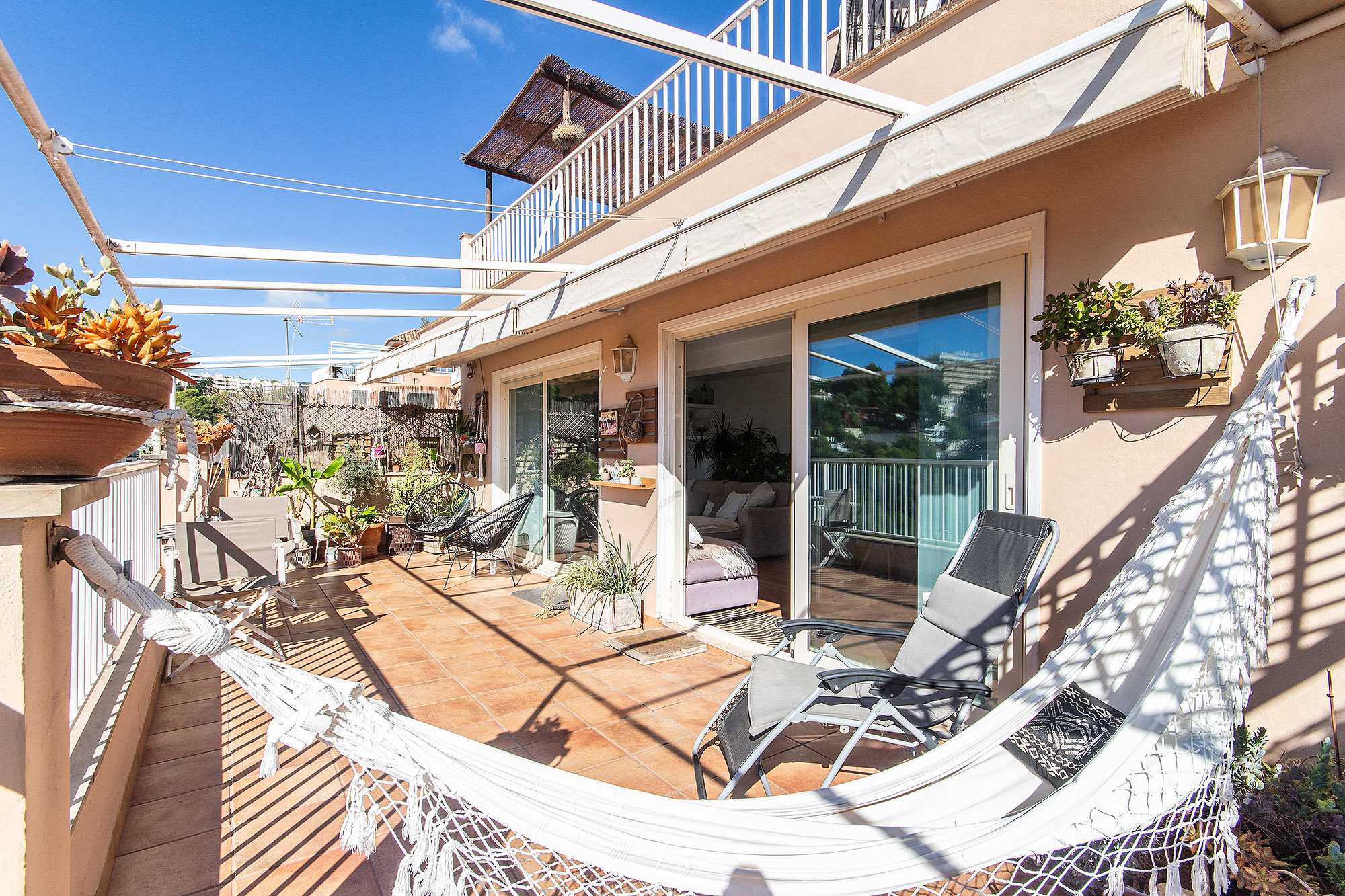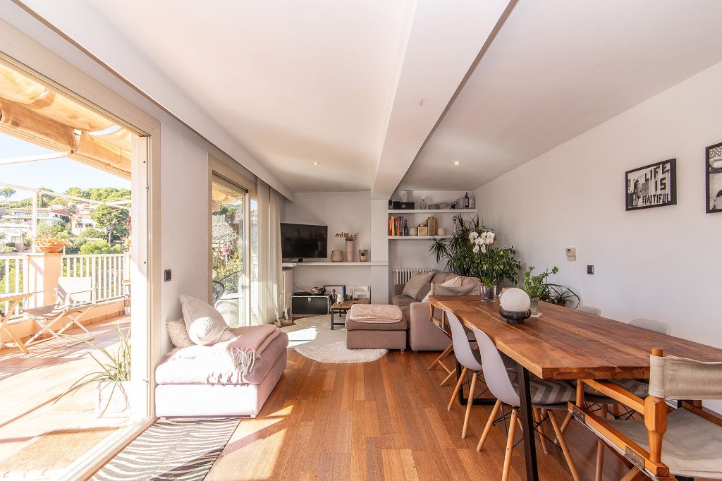 En un total de 94 m2 de superficie habitable, el salón se encuentra al lado de la terraza, detrás de ella la cocina con fogones de gas, que se puede abrir fácilmente al salón, 3 dormitorios (uno de ellos con baño en suite y aire acondicionado) y otro baño.