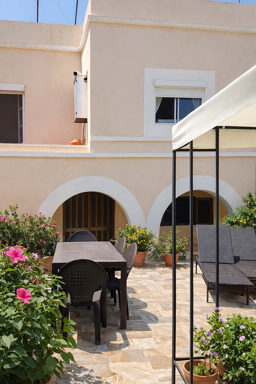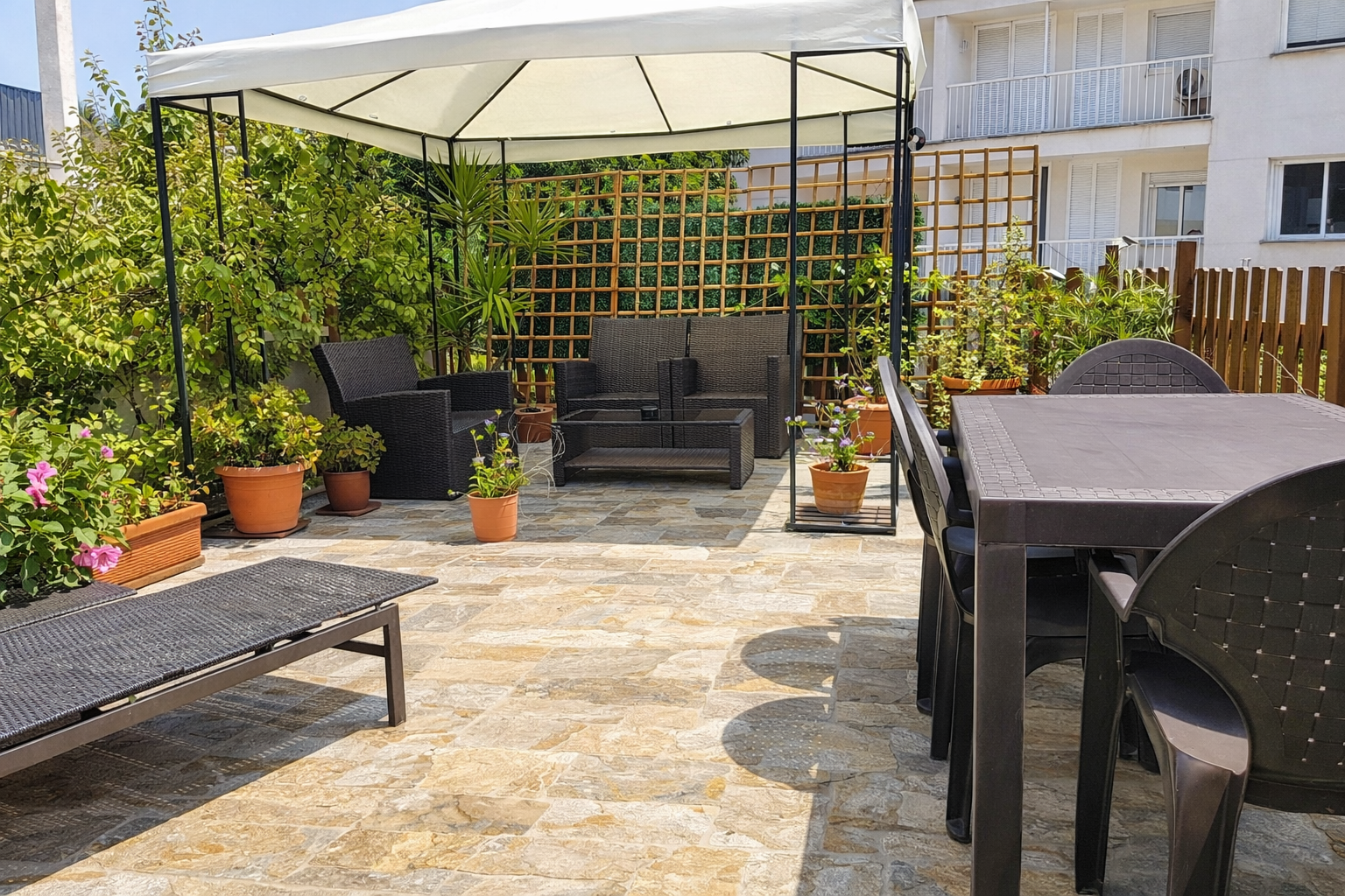 Apartment 1 mit 75m2 verfügt über eine große Küche, ein großes Doppelschlafzimmer mit Duschbad und ein Esszimmer, das auf die 60 m² große Terrasse mit Pergola führt.
