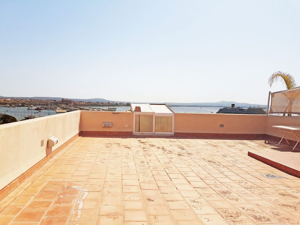 Das Penthaus befindet sich im obersten Stockwerk eines luxuriösen, sehr gepflegten Apartmentgebäudes mit Lift, welcher direkt bis in das Apartment führt. Von der Terrasse auf der Wohnebene des Penthouses bereits hat man einen Panoramablick über die Bucht von Palma inklusive der Kathedrale und den Hafen mit den ein-und auslaufenden Kreuzfahrtschiffen.