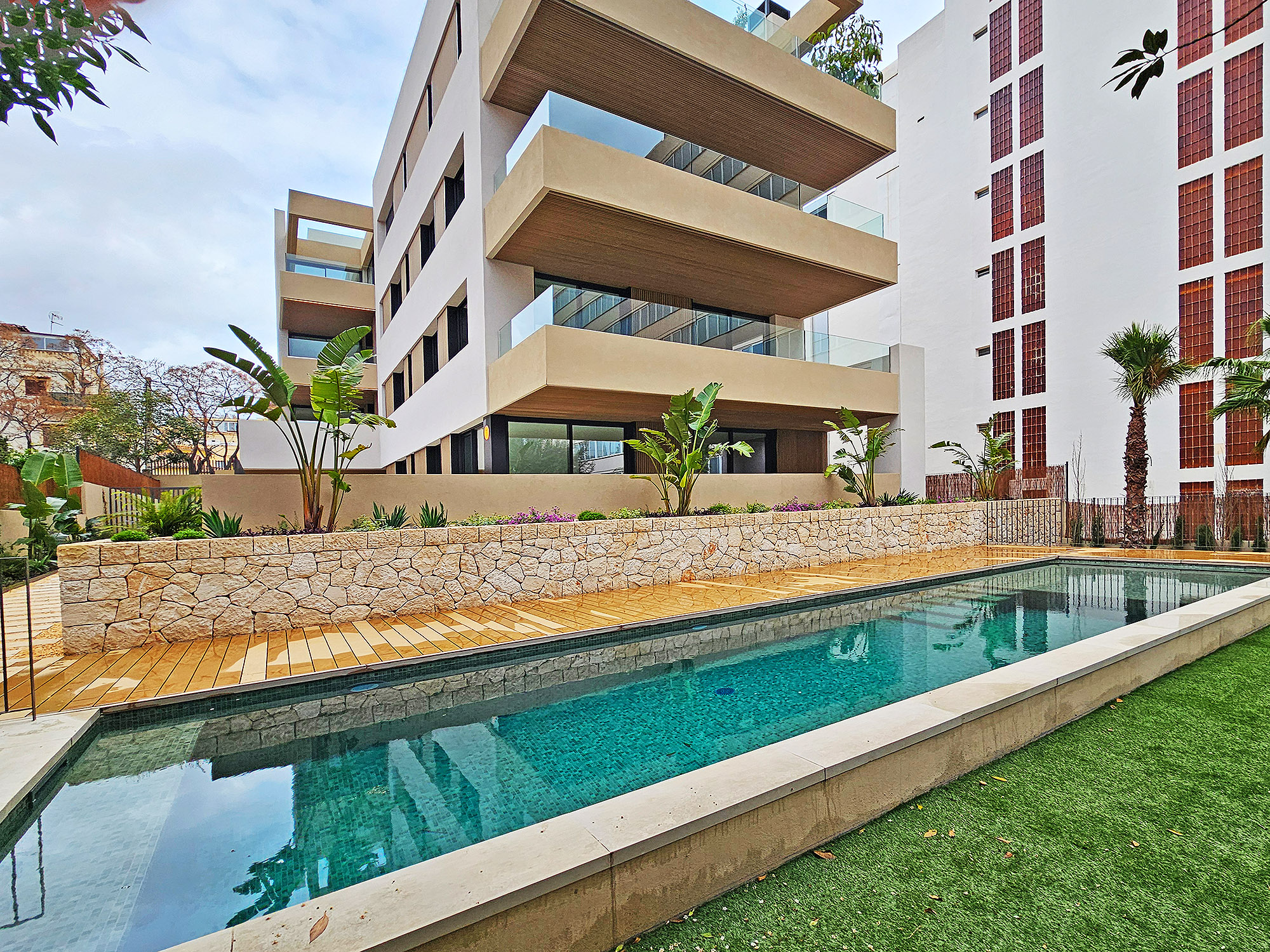 Dieses Neubauprojekt einer Apartmentanlage der Luxusklasse befindet sich in El Terreno nahe dem Park Bellver in ruhiger und doch urbaner Lage, nahe dem Zentrum von Palma. Viele Geschäfte, Restaurants und der Paseo Maritimo sind fussläufig erreichbar.