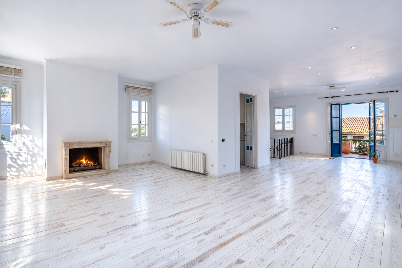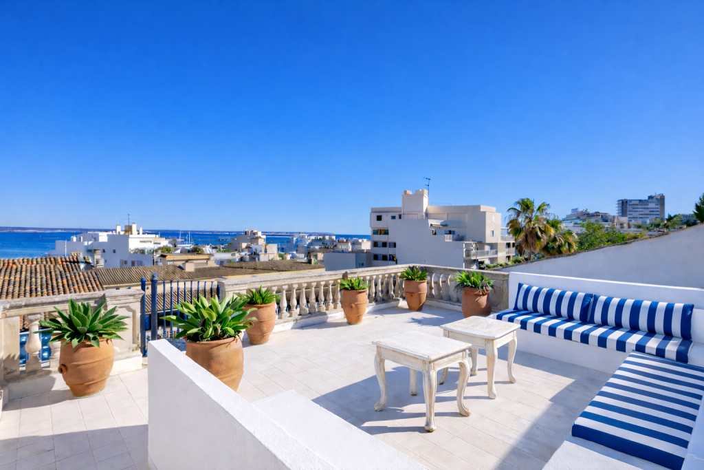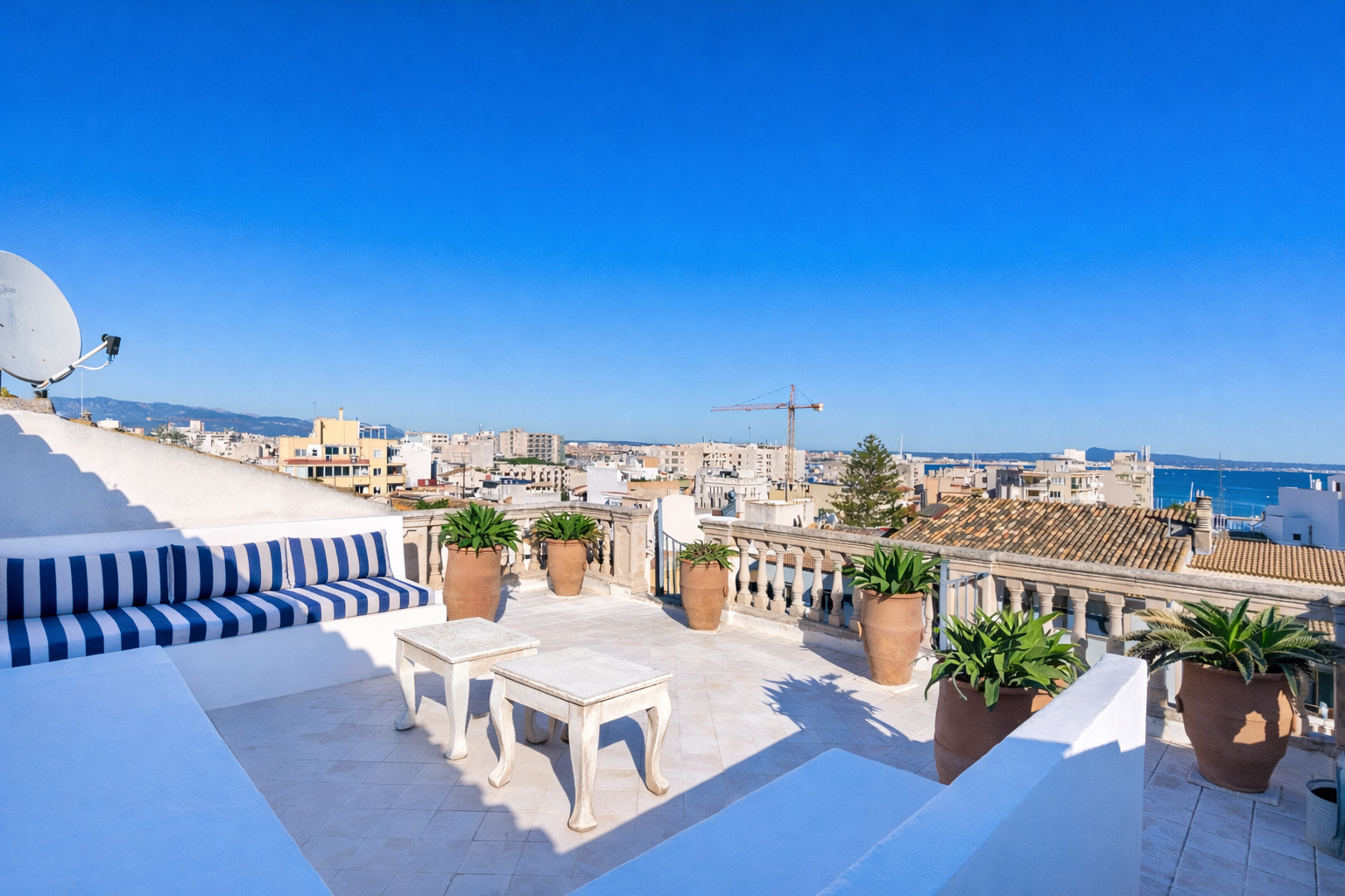 3. Stock: offene Terrasse mit Panoramablick auf das Meer und die Berge