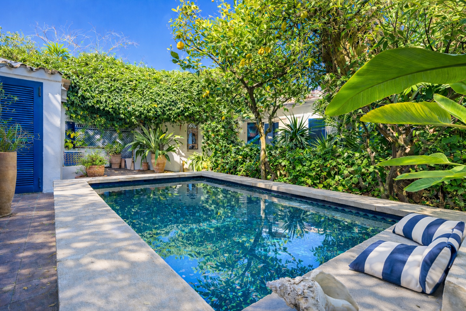 1. Stock: repräsentatives Entrée, Waschküche, begehbarer Kleiderschrank, offener Wohnbereich, 2 Schlafzimmer , 1 Badezimmer, Zugang zum dekorativen Patio mit beeindruckender Bepflanzung und Brunnen