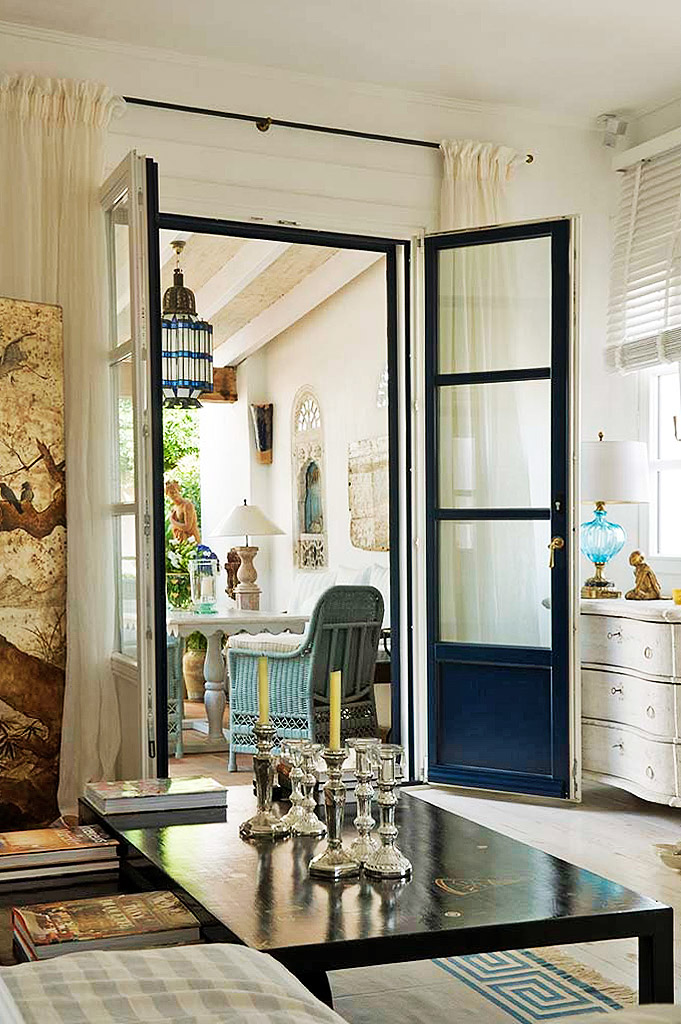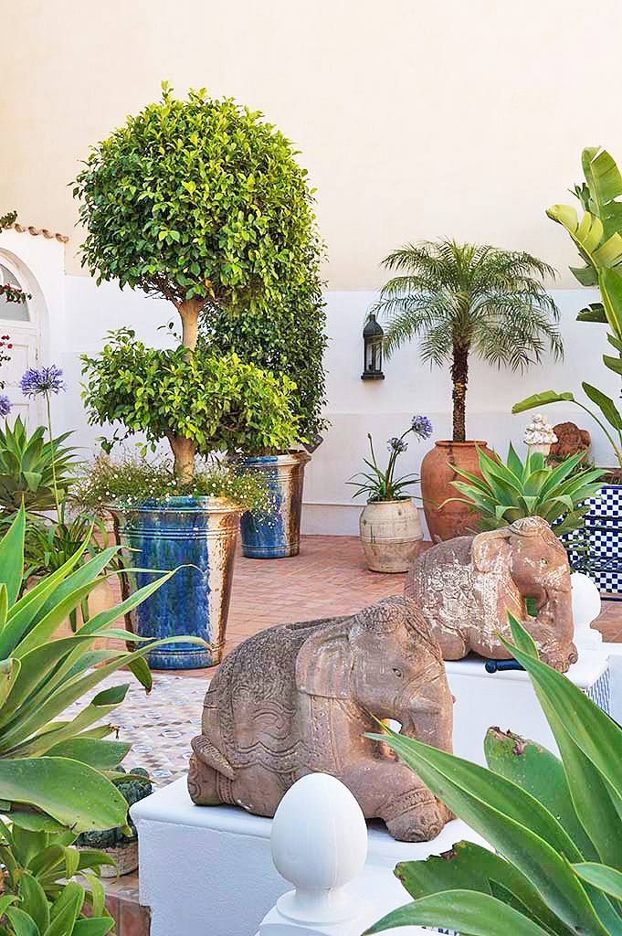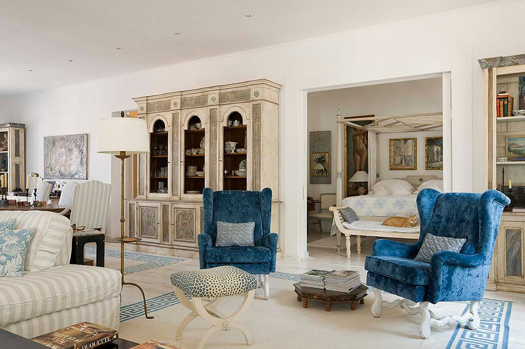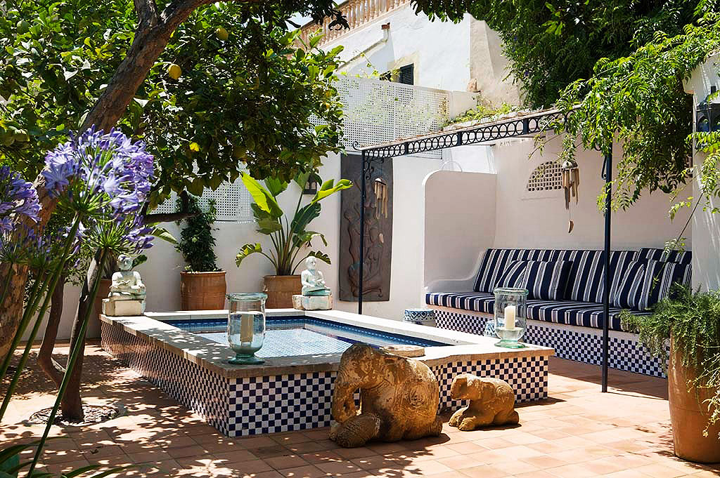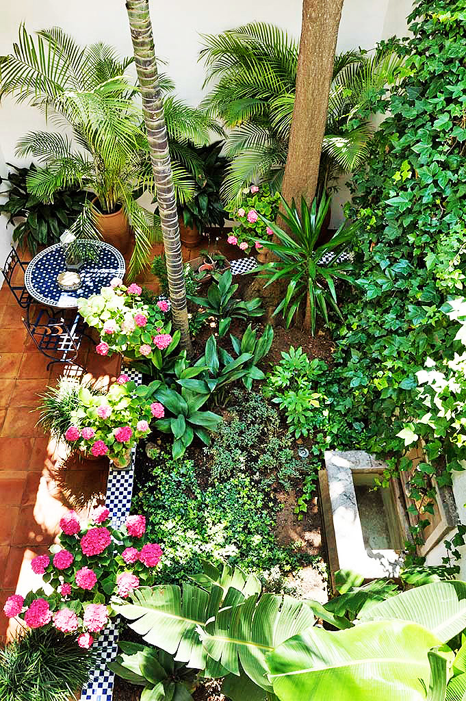 1: a våningen: representativ entré, tvättstuga, klädkammare, vardagsrum med öppen planlösning, 2 sovrum, 1 badrum, tillgång till den dekorativa uteplatsen med imponerande plantering och fontän