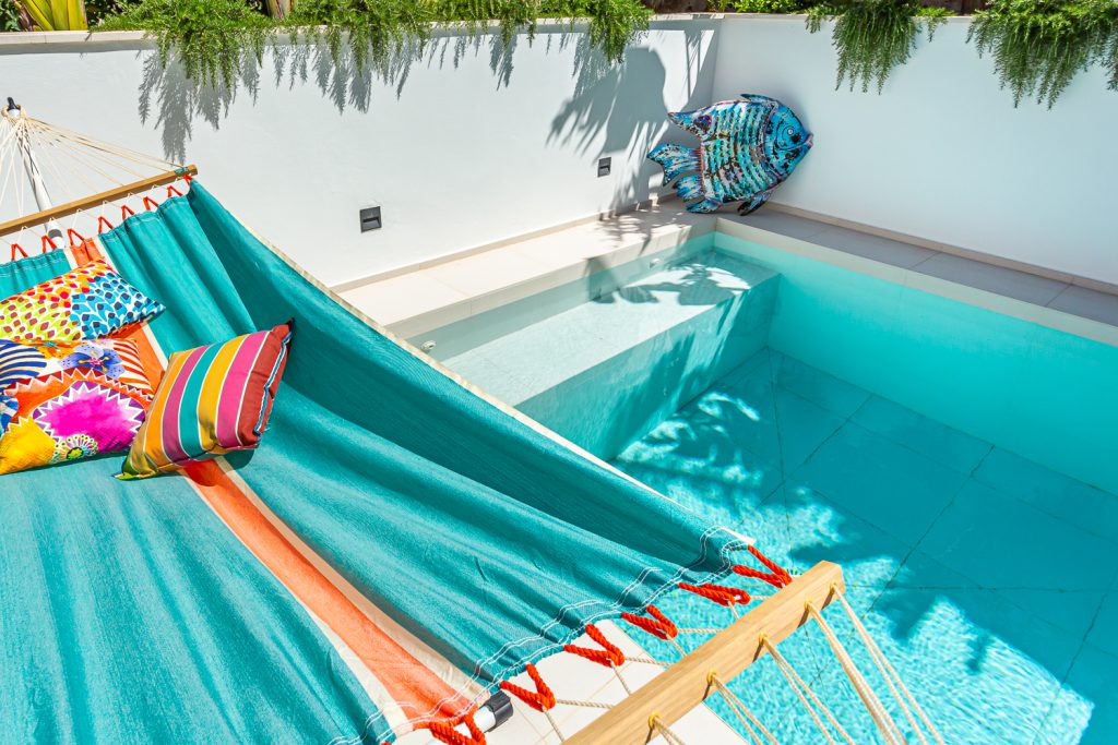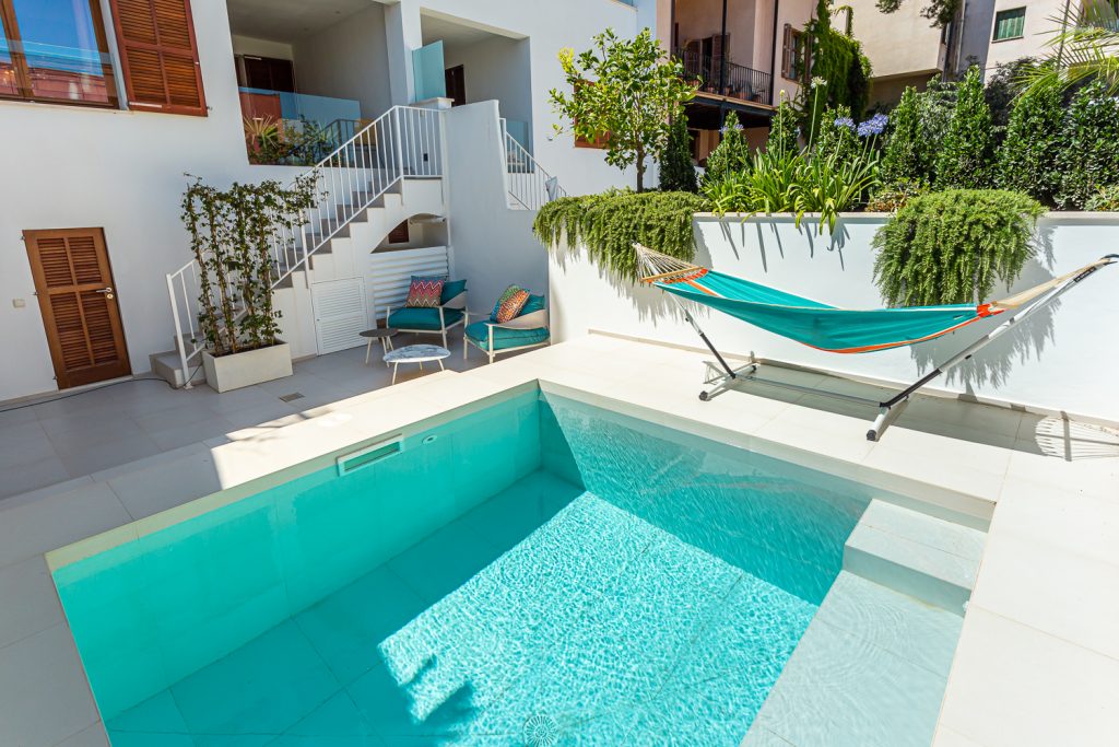 Trädgårdsområdet erbjuder ytterligare 68 m2 öppen terrass med en liten privat pool.