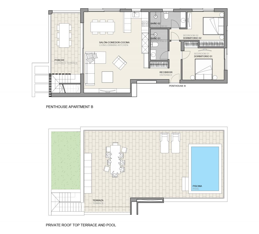 Denna imponerande takvåning på 219m2 har en öppen planlösning med vardagsrum och matplats med angränsande kök och täckt terrass, 2 sovrum, 2 badrum och en stor takterrass med privat pool. Detta inkluderar 2 parkeringsplatser och ett stort förråd. Utrustningen inkluderar golvvärme, luftkonditionering, indirekt belysning, inbyggda ekskåp, designkök och endast högkvalitativa material.