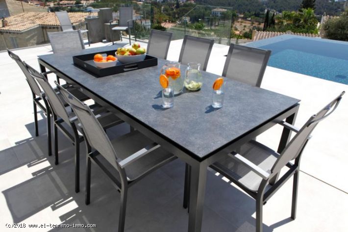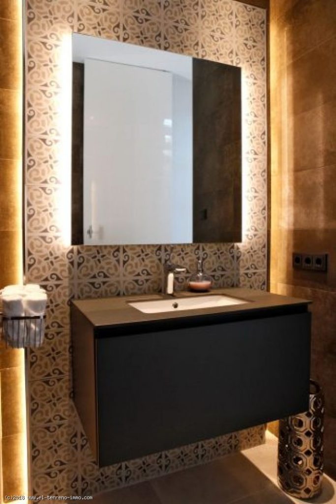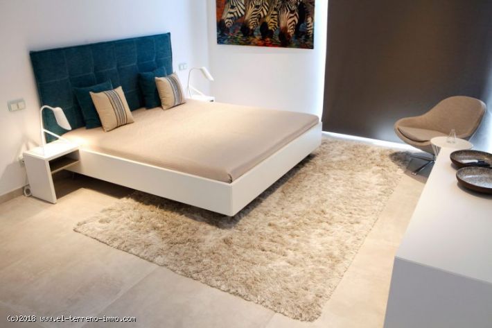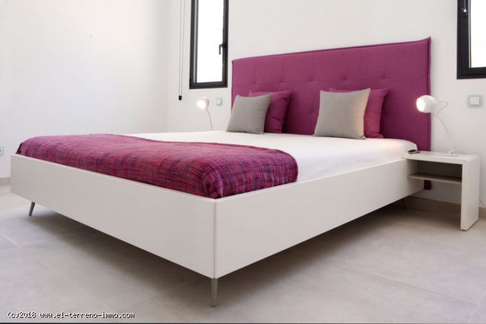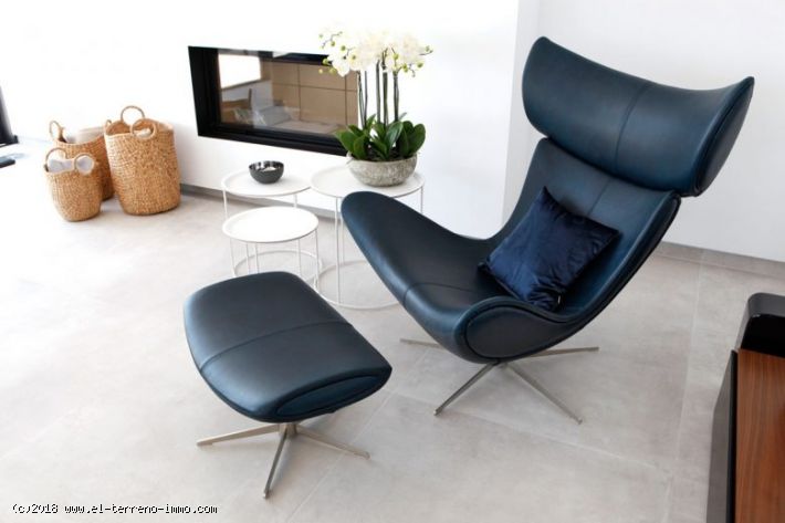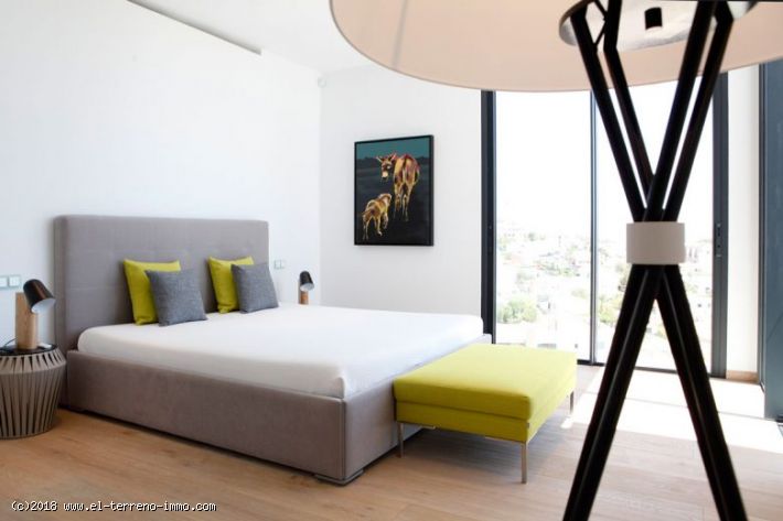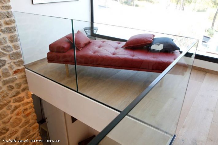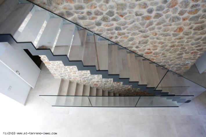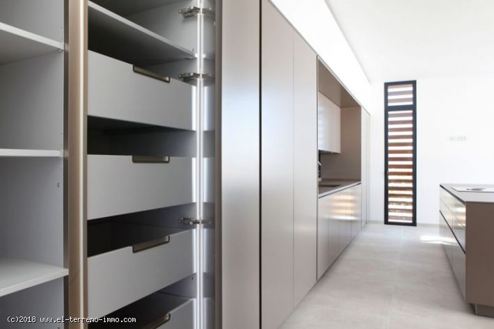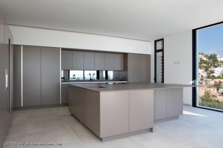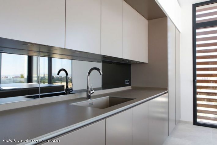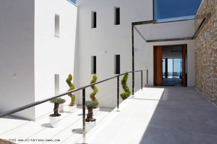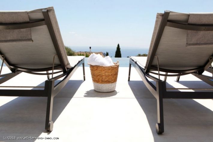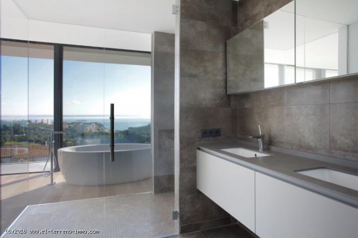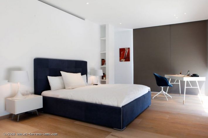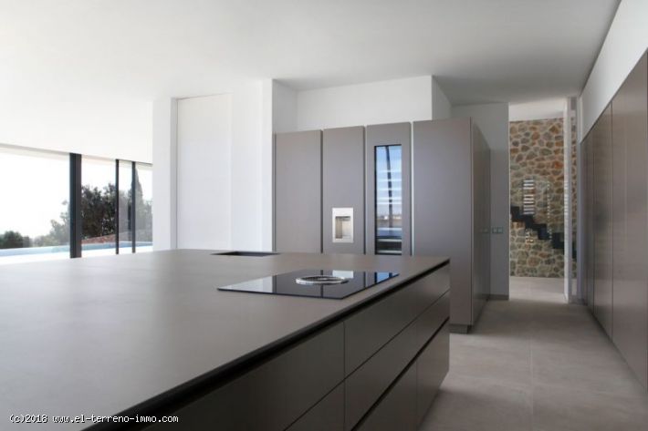 På bottenvåningen finns det stora vardagsrummet och matsalen och det fantastiska köket, därifrån har du tillgång till terrassområdet med infinitypool. Det finns också 2 sovrum på denna nivå, alla med eget badrum, en gästtoalett och ett tvättstuga. På övervåningen finns ytterligare 3 sovrum med eget badrum, varav två har tillgång till en solterrass. I källaren finns garaget för 5-8 fordon, liksom andra mycket rymliga utrymme för kontor, gäster, förvaringsmöjligheter, etc.